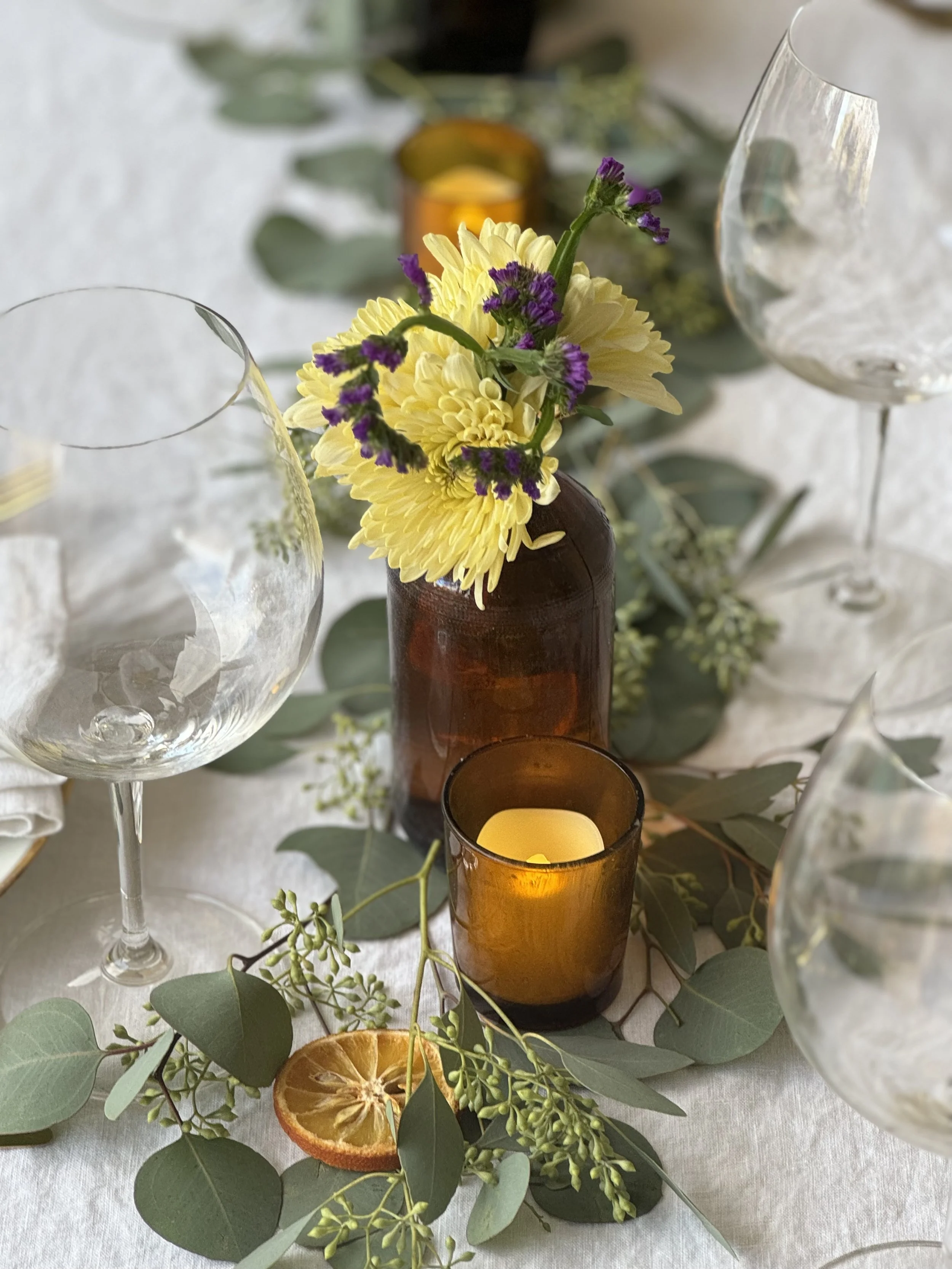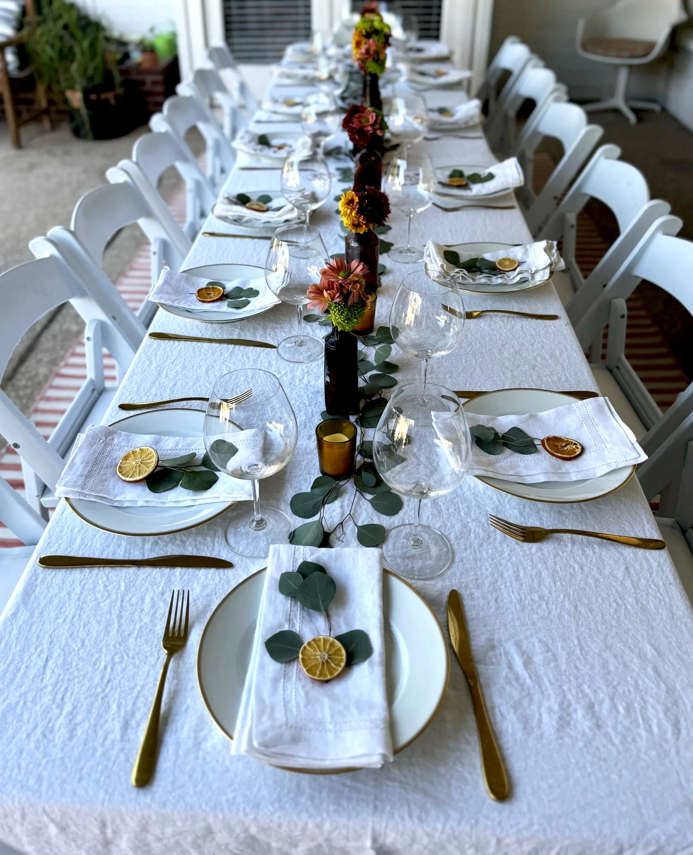It has become a tradition that we host our families for Thanksgiving. This will be our 5th year! I always set a long table on our back patio for the adults and then a small kids table. I still lean into the Thanksgiving and fall vibes and love to bring in all the fall colors with amber glass, terracotta and gold tones. Of course tons of greenery and bright fall flowers. I love getting together over delicious food and wine but honestly setting the table is my favorite part of the day. Scroll down to see some of my past Thanksgiving tables and to see my top favorites for setting the perfect table. Hope you have a Happy Thanksgiving!